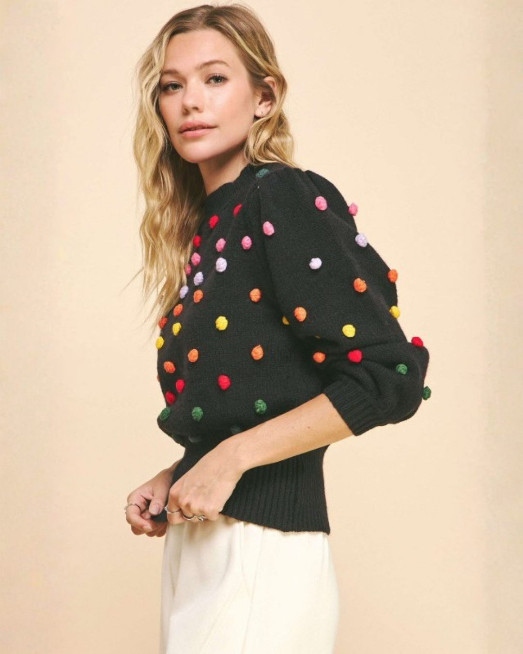 Bring a playful twist to your everyday looks with this black knit sweater, decorated with colorful 3D pom pom dots that pop against the dark base. The puff sleeves add a modern, boutique-inspired touch, while the fitted ribbed hem keeps the shape flattering and easy to style.