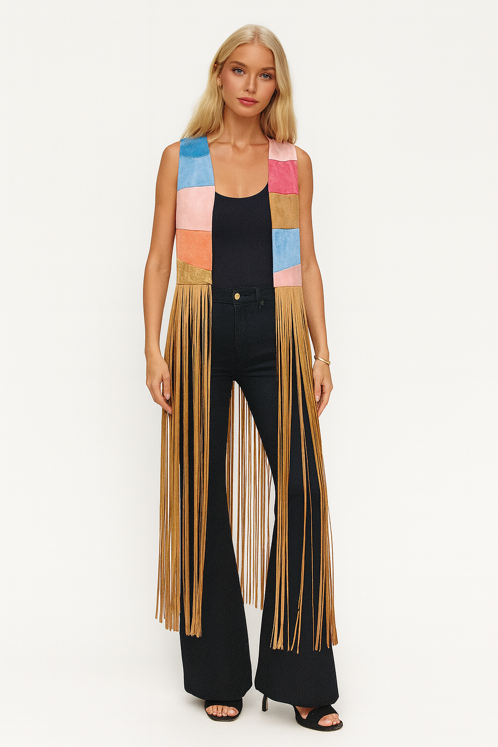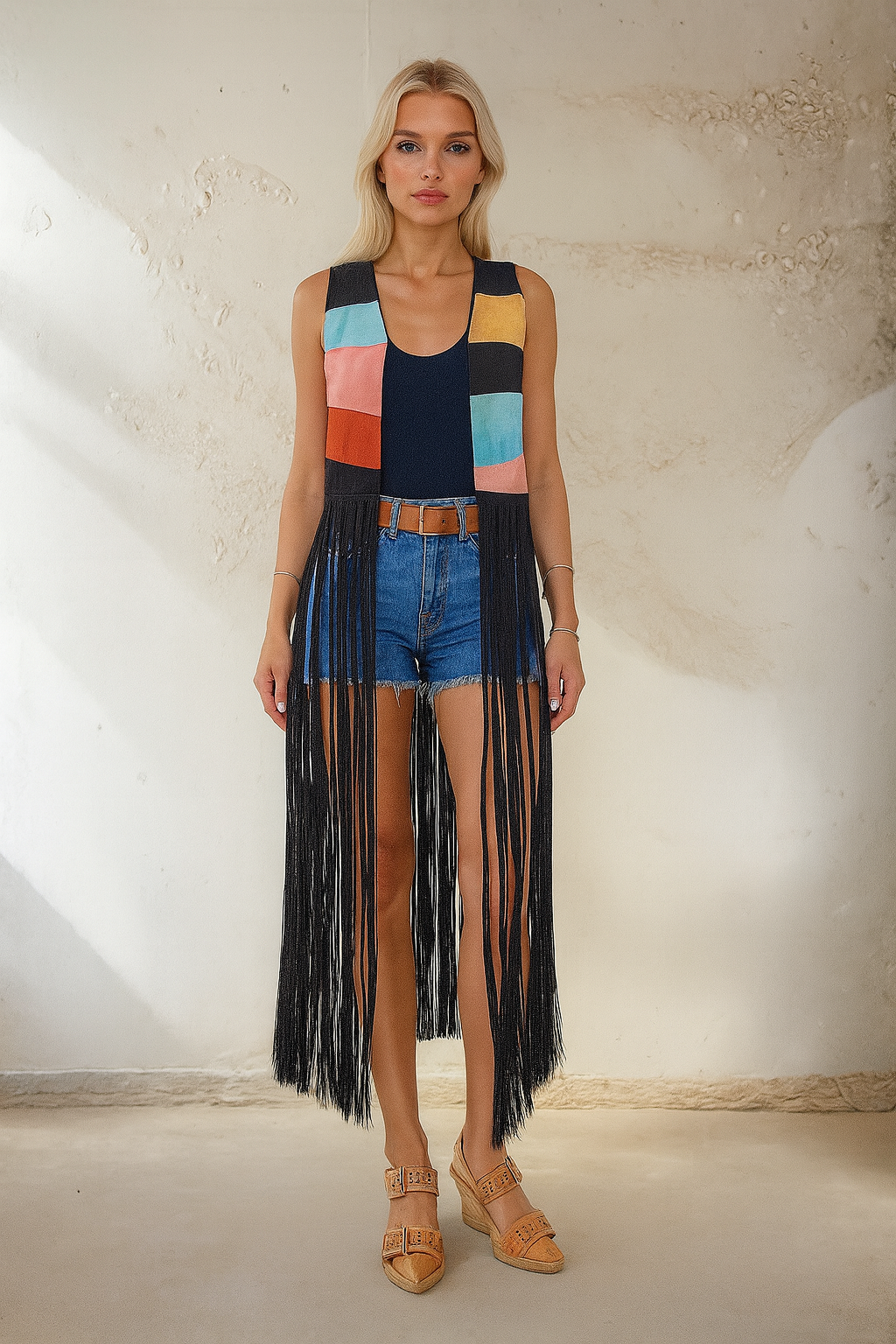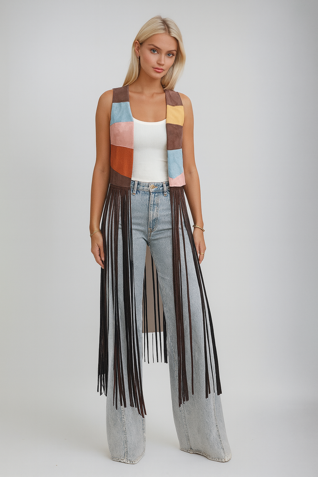 The soft knit patchwork front gives it an artistic, vintage feel, while the dramatic fringe brings that iconic free-spirited vibe associated with festival fashion and modern boho Western aesthetics. Whether you love color, texture, or pieces that feel unique and expressive, this vest elevates any outfit with personality.