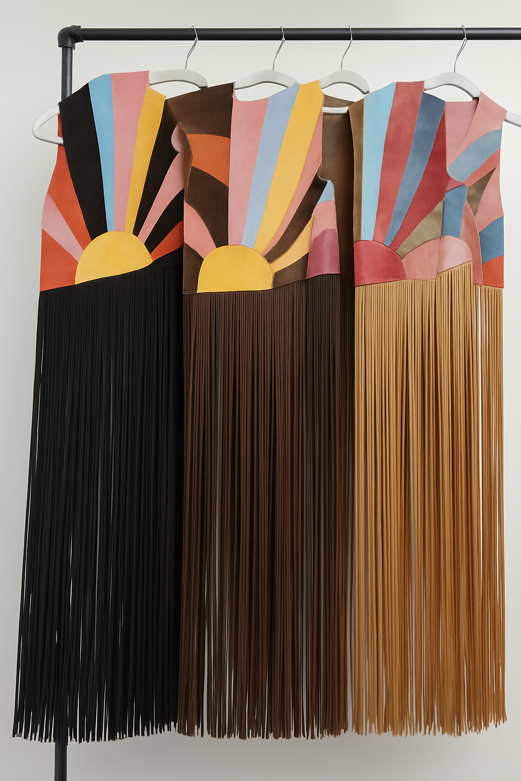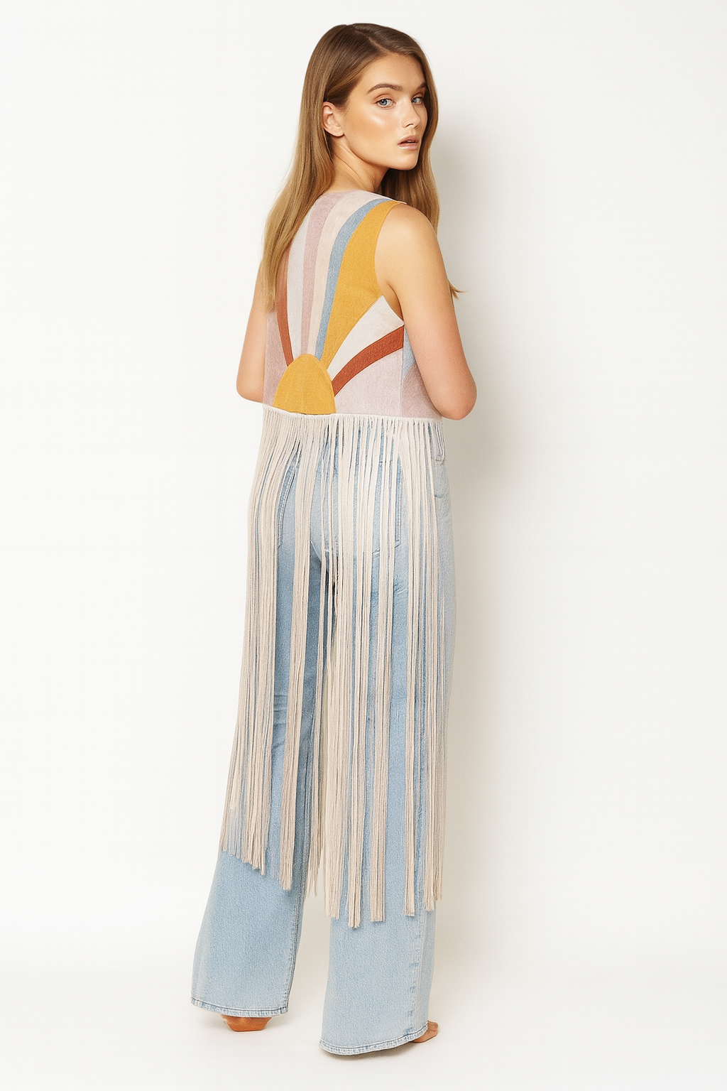 Channel effortless festival energy with this Coachella-inspired fringe vest, designed with a retro sunset motif and ultra-long flowing fringe that creates beautiful movement. The look blends boho style with subtle Western and cowboy influences, making it a standout layer for denim, flares, boots, or anything with creative edge.
