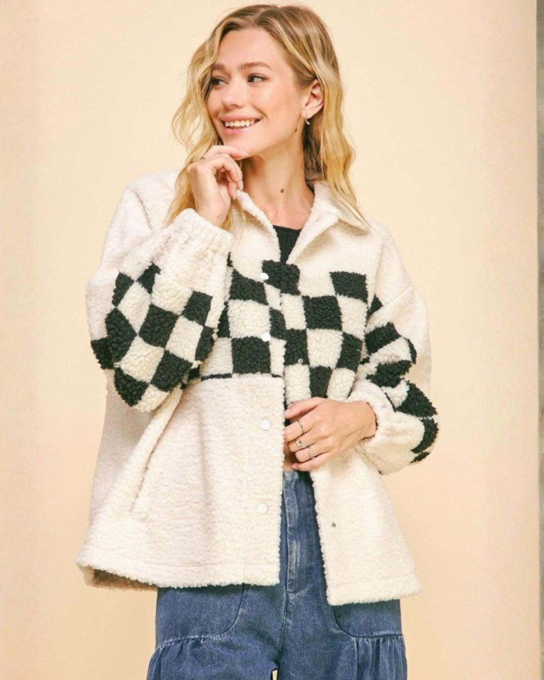 Checkered Sherpa Jacket – Black & White Fuzzy Oversized Streetwear Coat