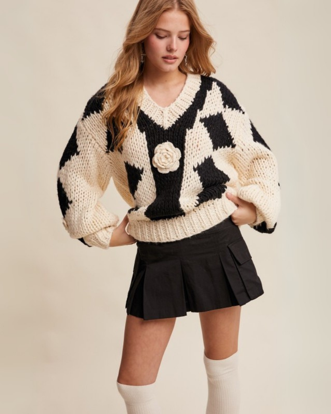 Elevate your knitwear game with this chunky hand-knit feel sweater, designed in a creamy tone with bold black geometric patterns. The 3D crochet flower applique adds a romantic, handmade touch that makes this sweater stand out. Crafted in soft, voluminous acrylic yarns, it’s equal parts cozy, textured, and stylish.