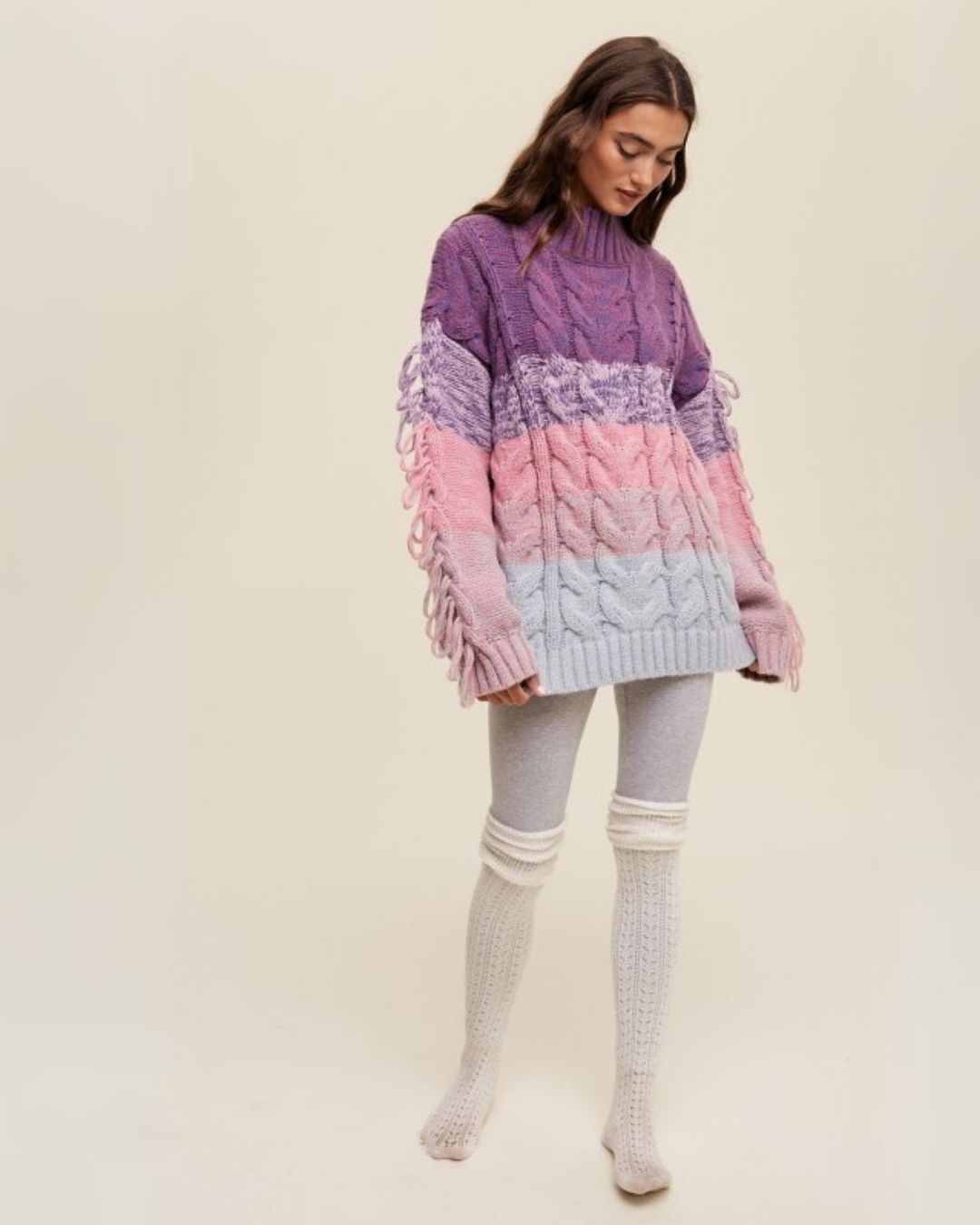 Make a statement with this chunky knit sweater that’s as bold as it is cozy. Designed with colorblock shades of purple, pink, and blue, it has a playful gradient vibe that stands out. The cable knit texture gives it a classic touch, while the fringe details along the sleeves add a cool boho twist.