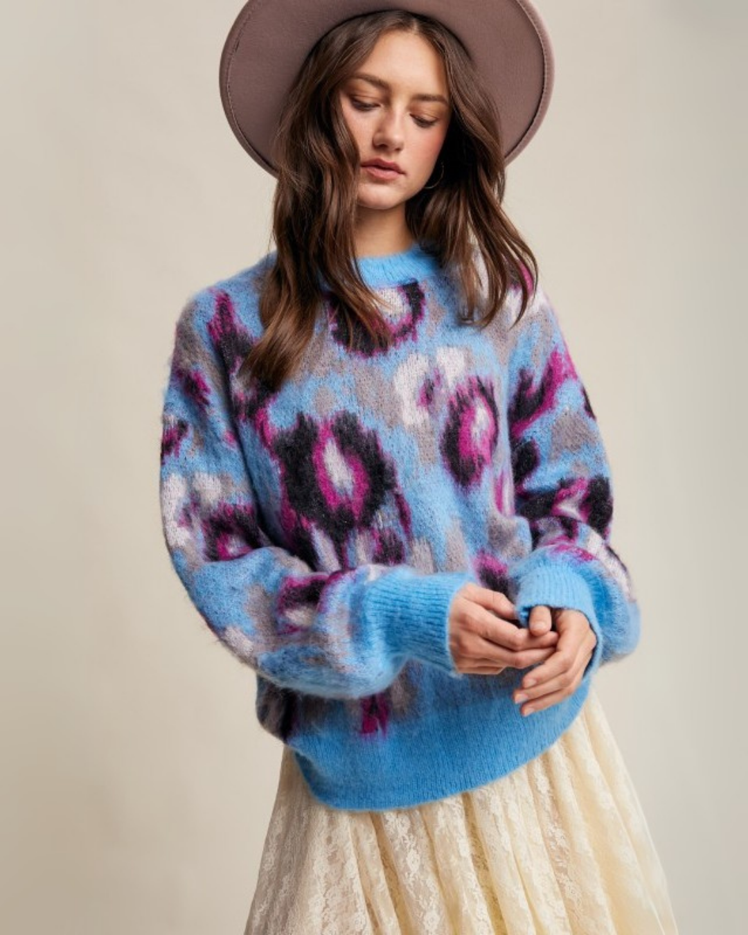 Fuzzy Abstract Leopard Knit Pullover – Light Blue