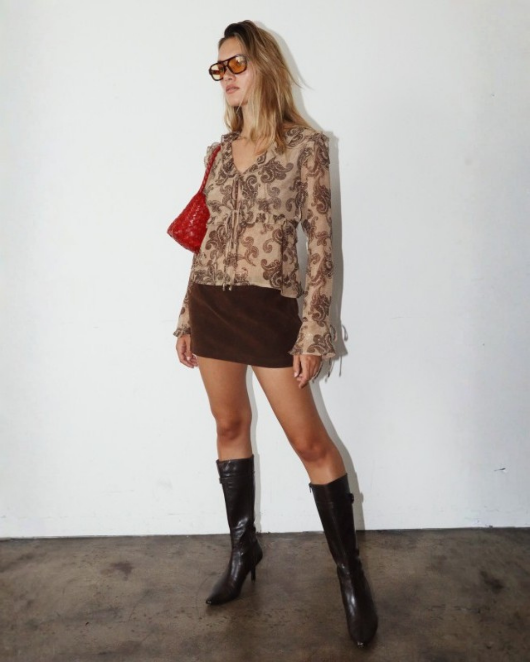 Paisley Tie-Front Ruffle Blouse – Vintage Tan