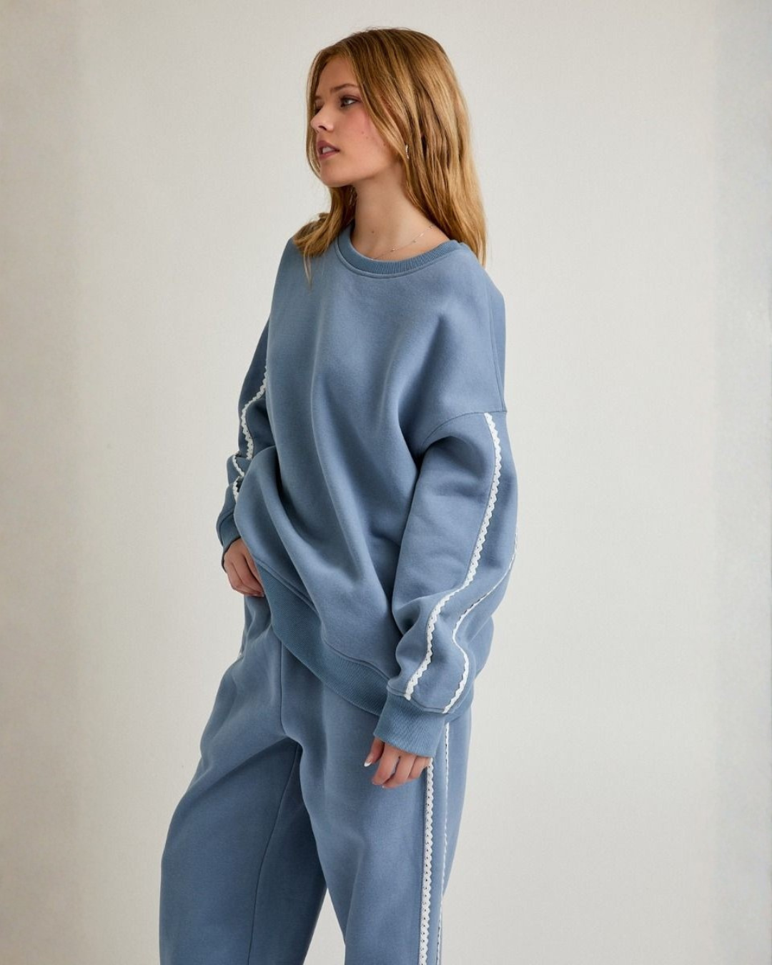 Dusty Blue Lace Trim Sweatshirt – Effortless Cool Meets Soft Street Style