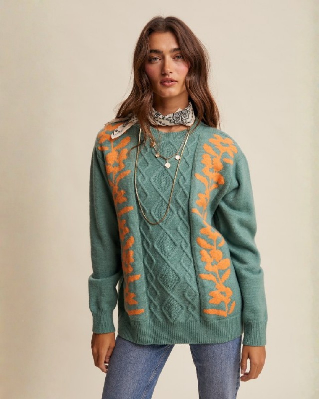 Floral Cable Knit Sweater – Sage Green Retro Cozy Pullover