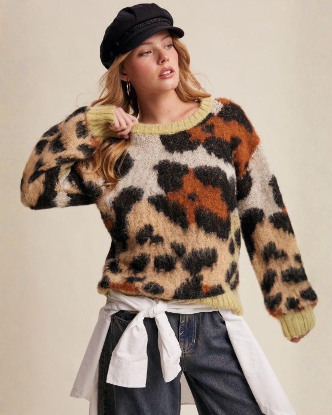 Turn up the cozy and the cool with this Abstract Leopard Fuzzy Knit Sweater — the perfect mix of soft...