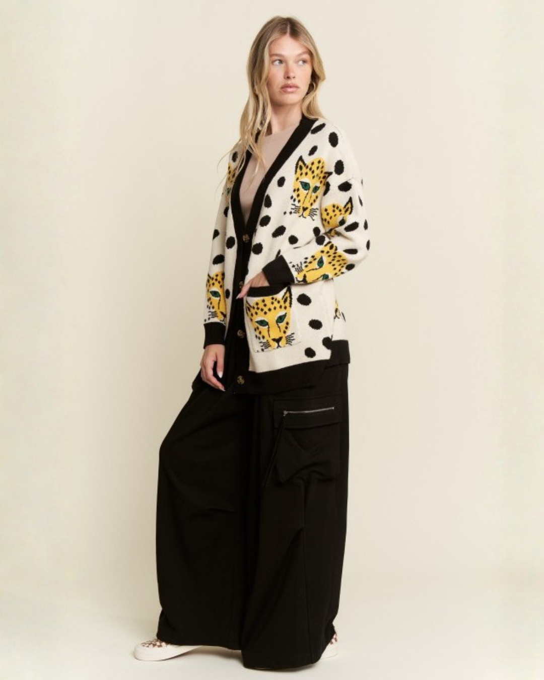 Leopard & Cheetah Graphic Knit Cardigan – Oversized Artsy Statement Sweater