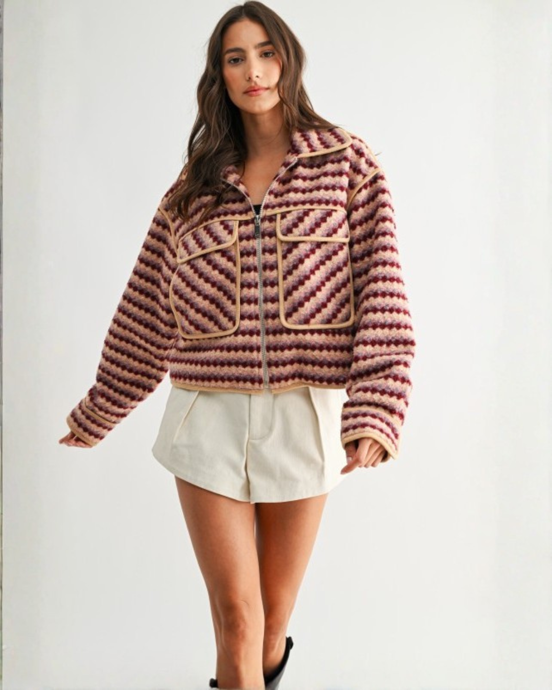 Retro Chevron Zip-Up Jacket – Burgundy Multi | Textured Vintage Style Outerwear